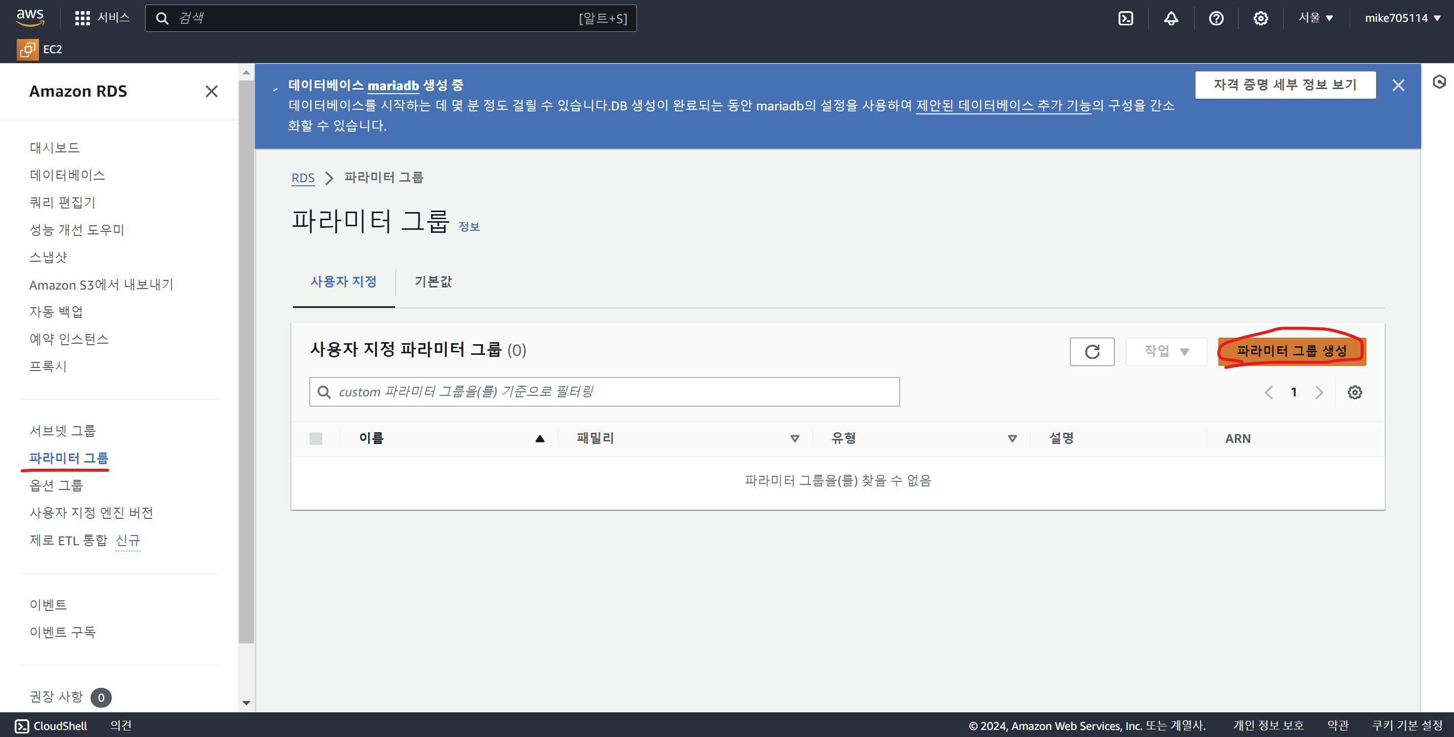 파라미터 그룹 패밀리는 생성한 RDS의 DB버전을 선택하면 됩니다.