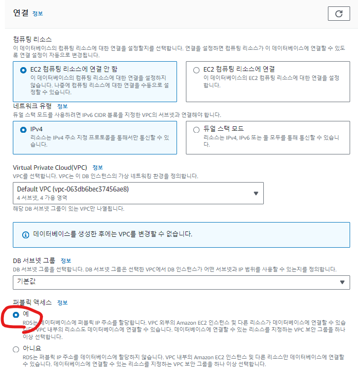 DB 외부 접속을 위해 퍼블릭 액세스는 예로 설정해줍시다.