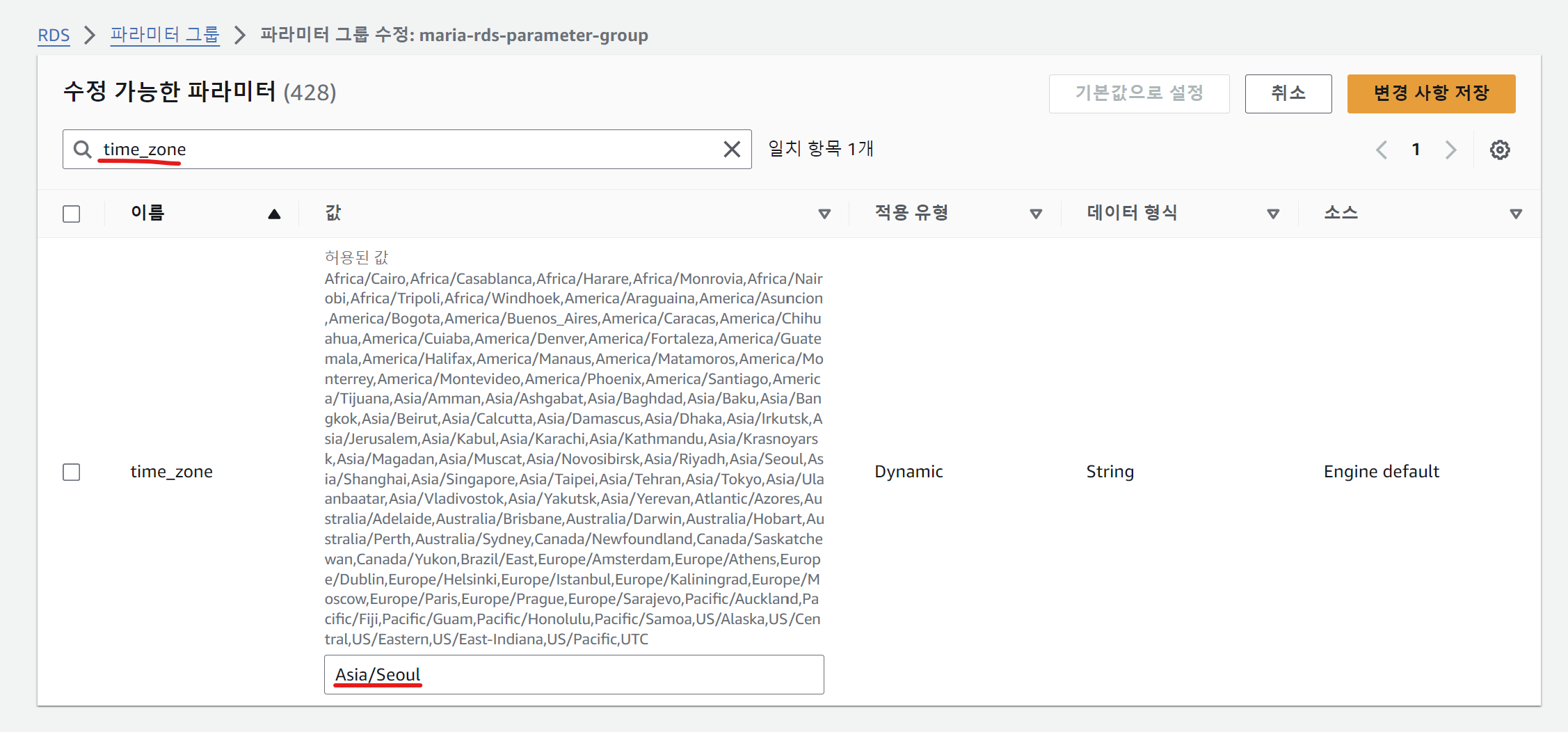 - time_zone 입력하여 값에 Asia/Seoul을 입력해준다.