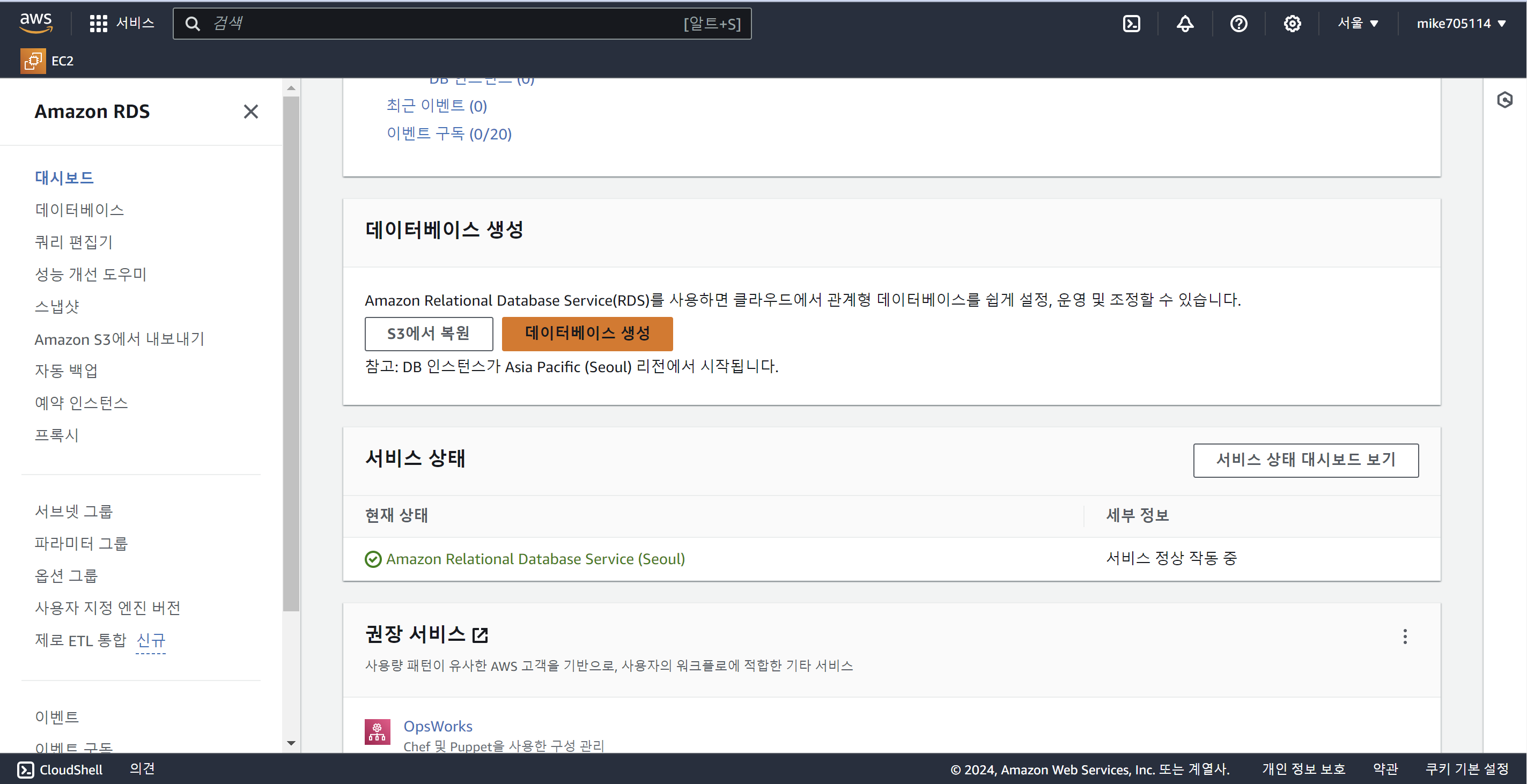 자 이제 데이터베이스를 생성하였으면 상태가 생성중 -> 사용 가능으로 변경될 때까지 기다려준다