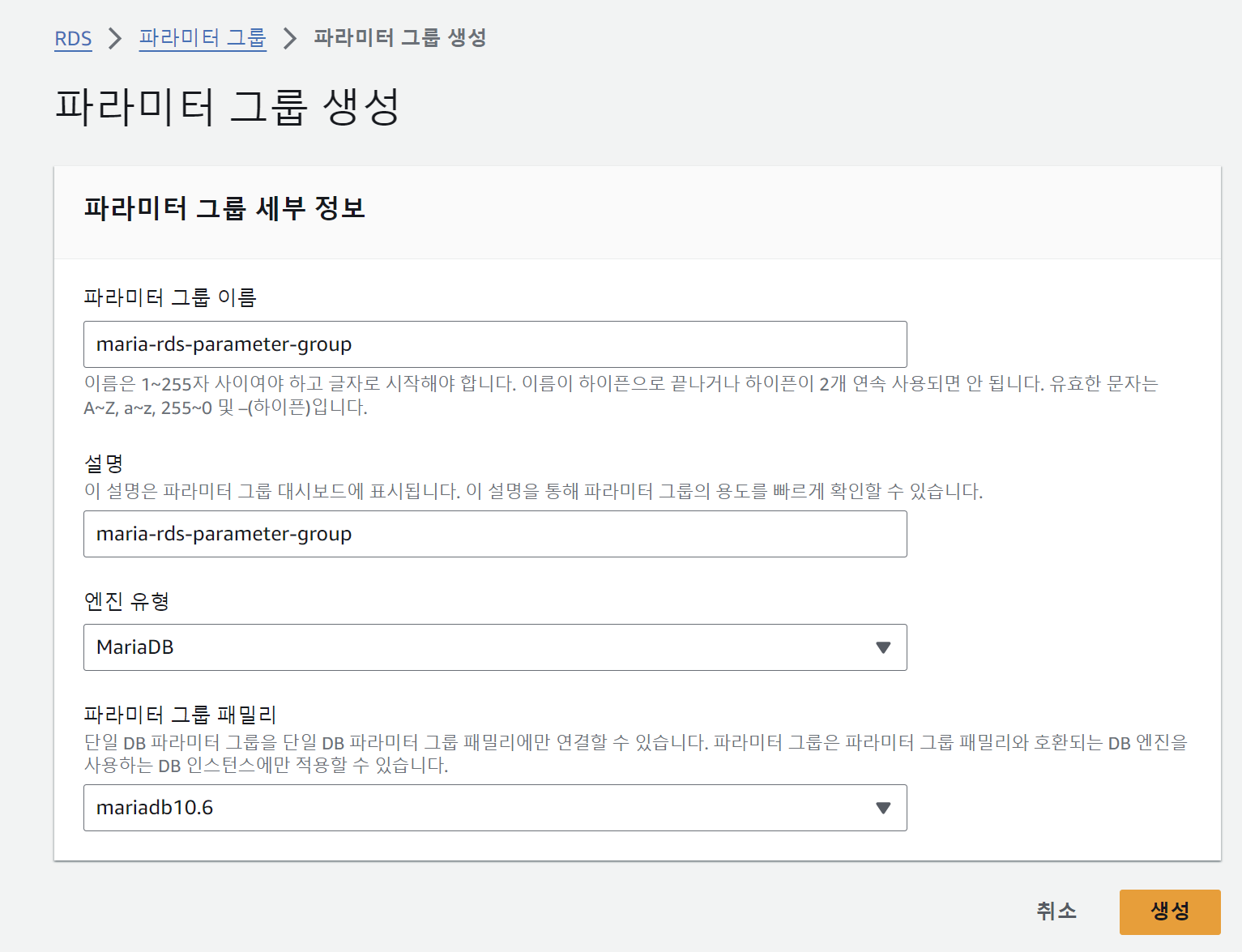 파라미터 그룹이름, 설명은 식별가능한 이름으로 설정하면 됩니다.