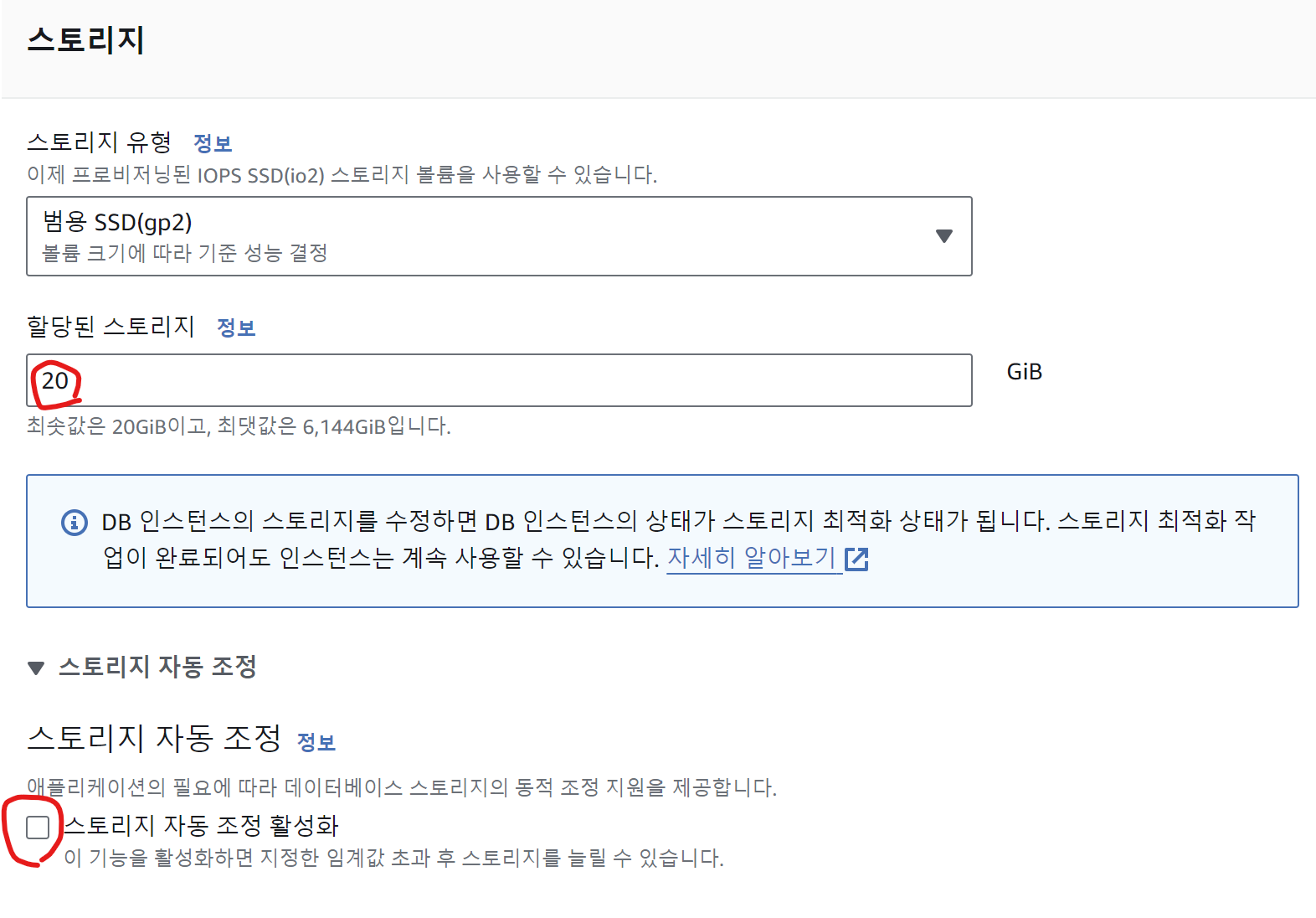 스토리지 자동 조정 활성화를 체크해제 합시다. -> 과금요인이 될 수도 있습니다.