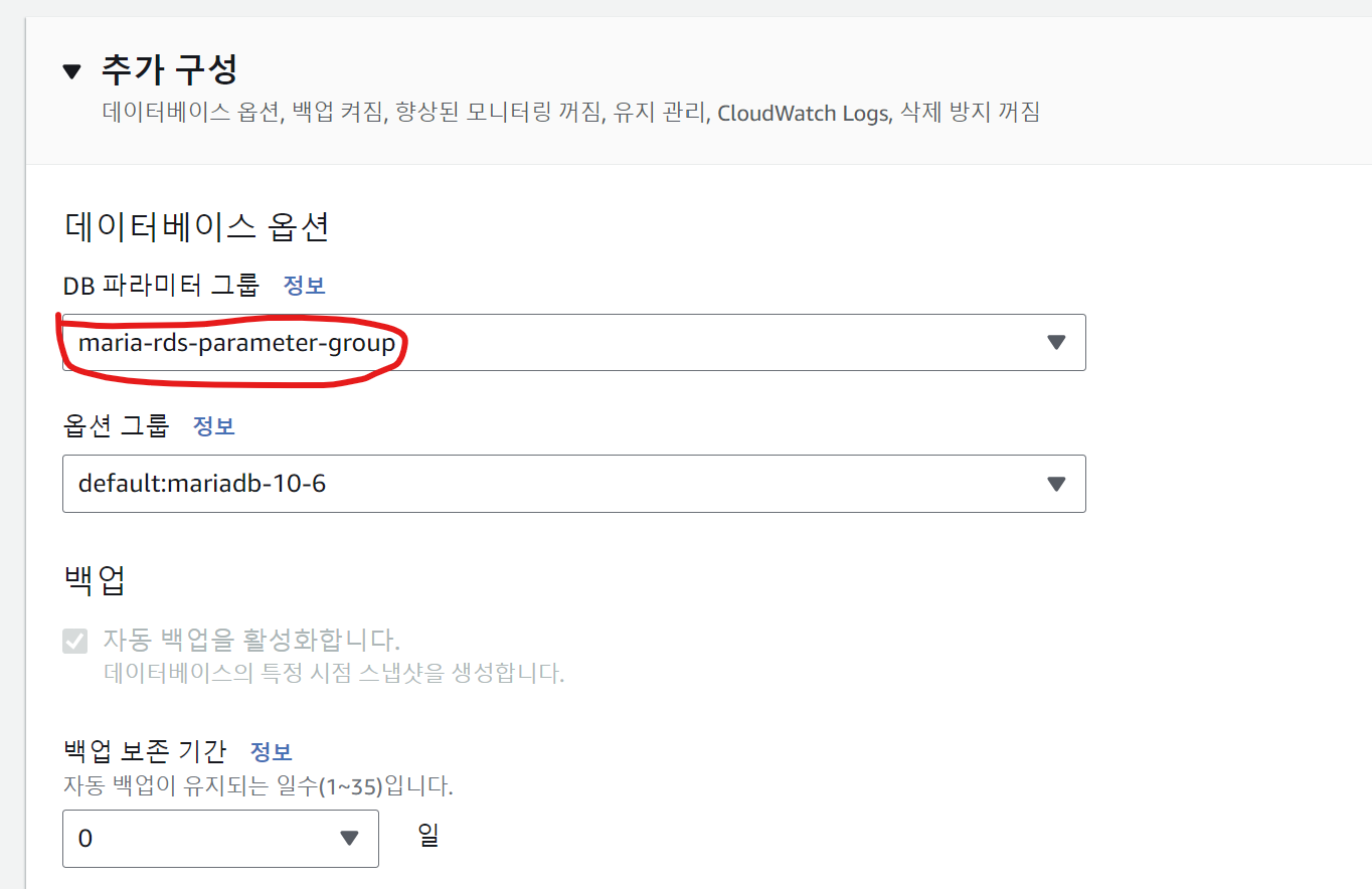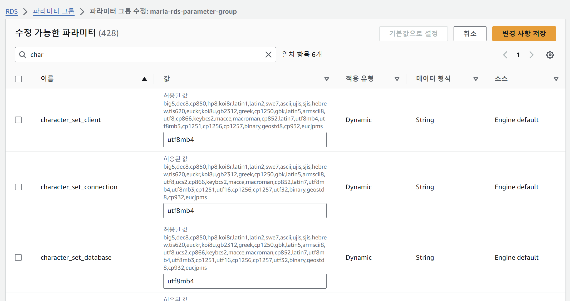 빨갛게 표시한 파라미터는 MariaDB에서만 RDS 파라미터 그룹으로는 변경이 안된다고 한다. 그래서 HeidiSQL에서 접속한 후, 직접 다음 쿼리를 수행해주었다.