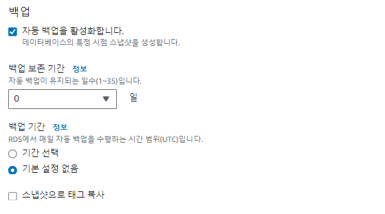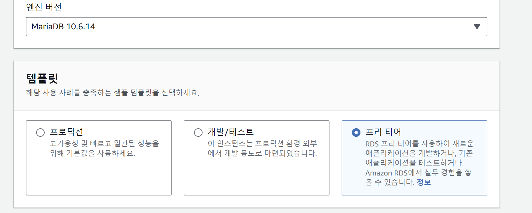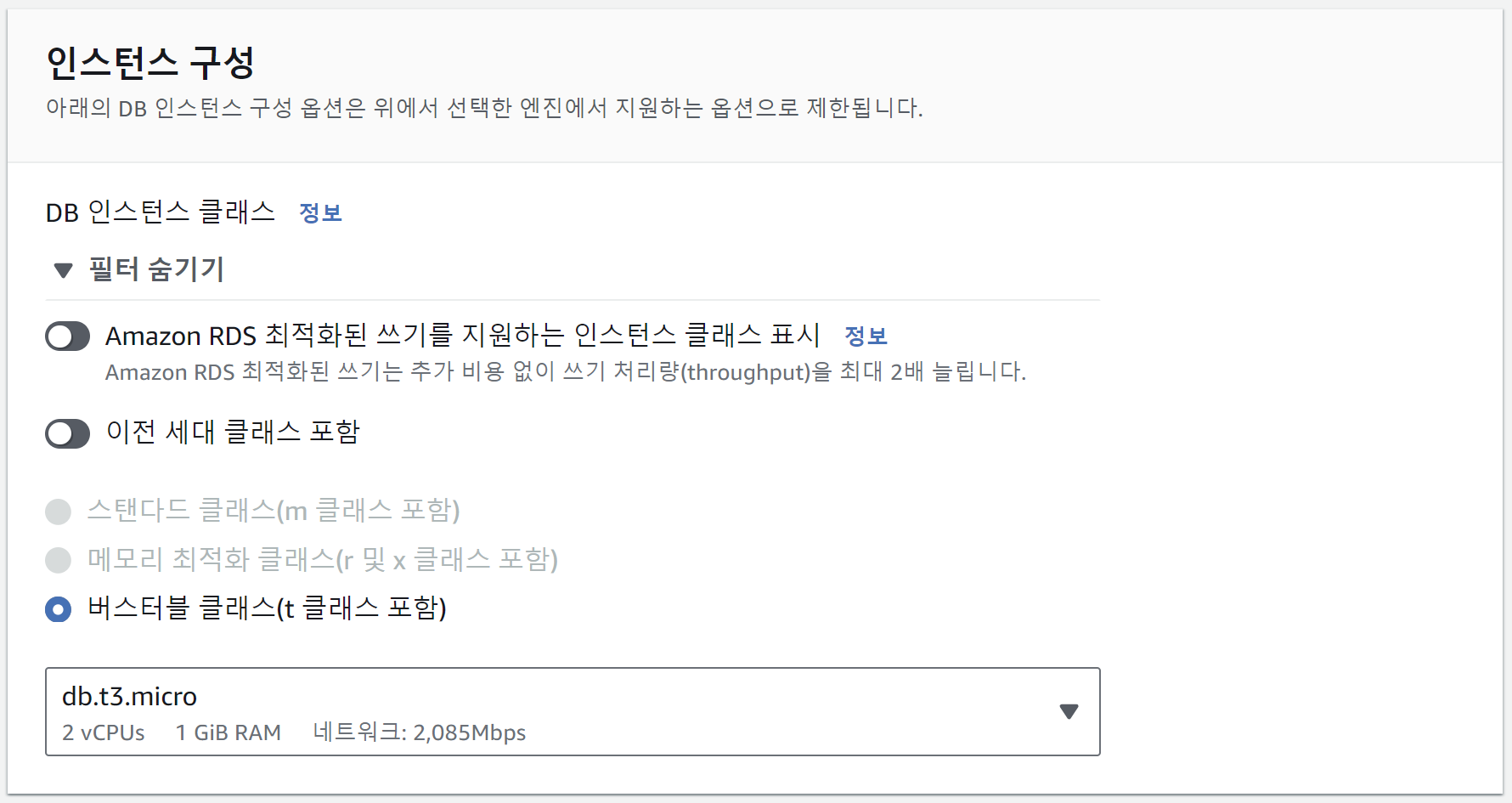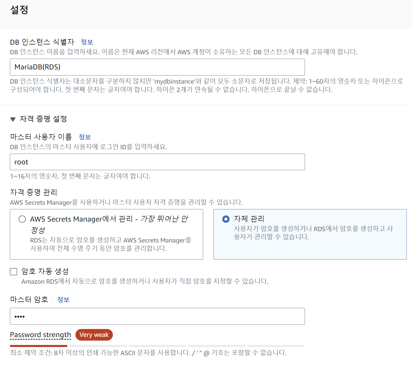 - DB 인스턴스 식별자: 자기 자신이 알아볼 수 있는 DB인스턴스 이름으로 설정
