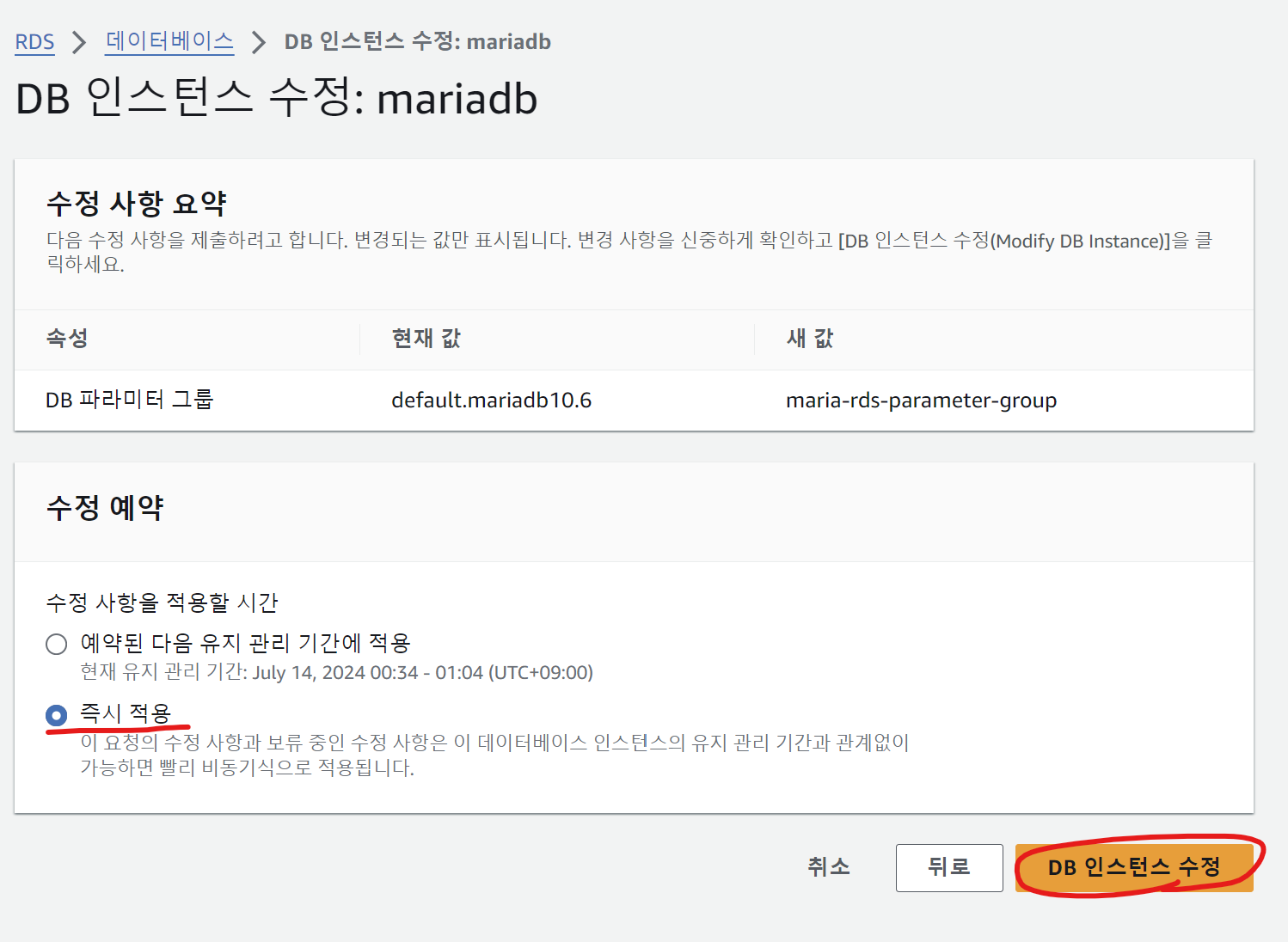추가 구성을 열어서 데이터베이스 옵션의 DB 파라미터 그룹을 방금 생성한 파라미터 그룹으로 변경하고, 가장 하단의 계속을 클릭한다. 즉시 적용을 클릭하고, DB 인스턴스 수정을 클릭한다.