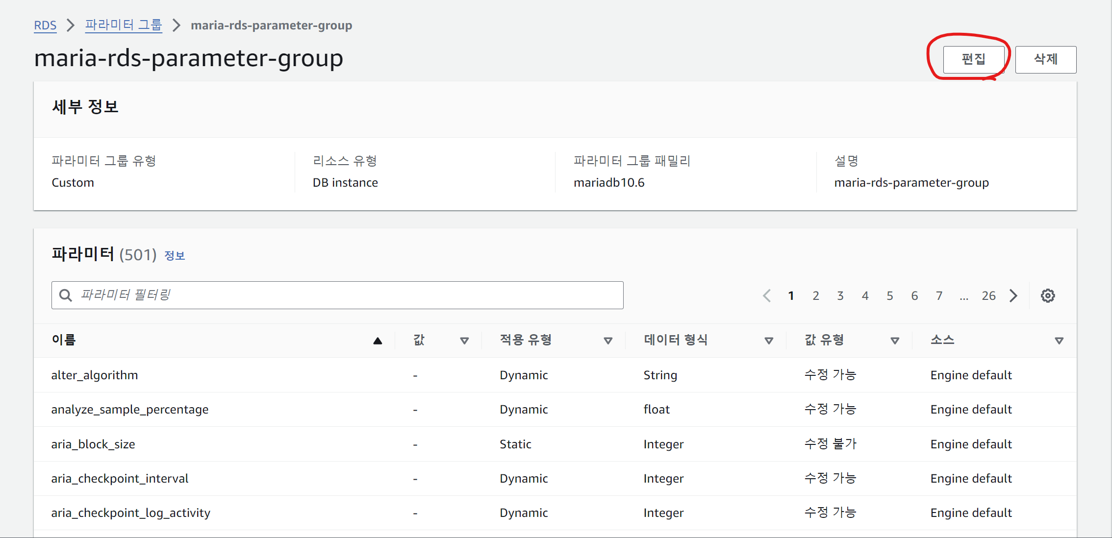 생성완료 후 해당 파라미터 그룹을 클릭하여 상세 페이지로 이동 후 편집 클릭 -> 편진모드로 전환