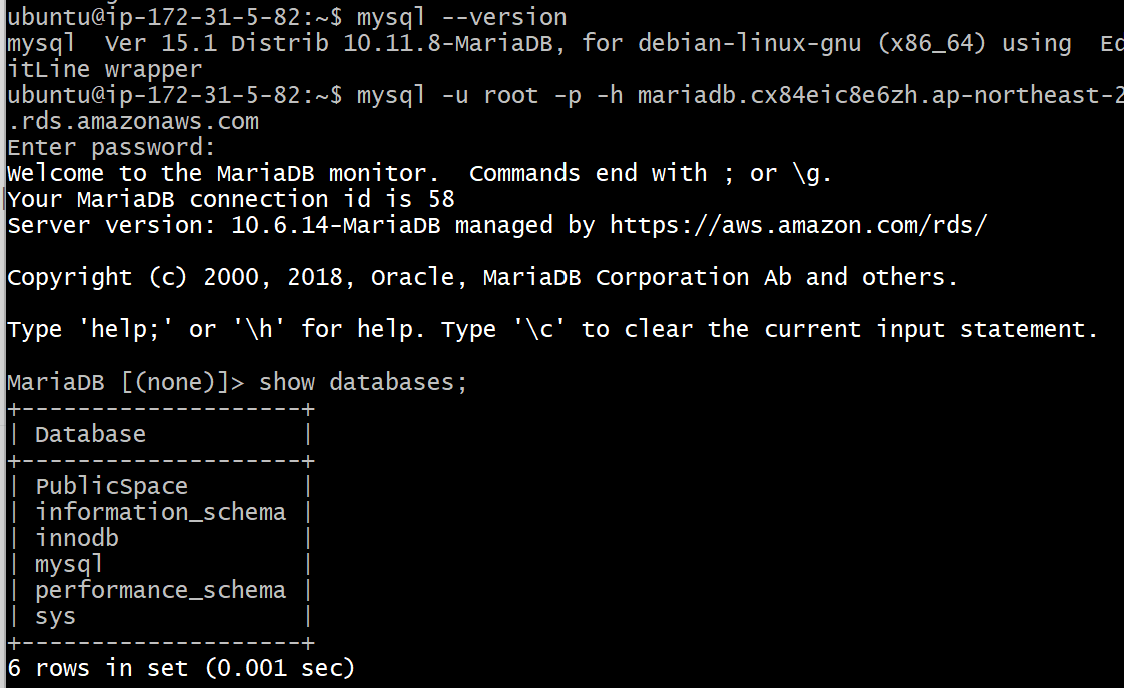 # 클라이언트가 잘 설치되었는지 확인 mysql --version # 접속 커맨드 mysql -u {유저명} -p -h {DB의 엔드포인트}