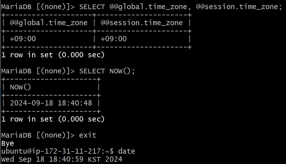 MariaDB에 접속하여 현재 시간을 확인한 결과, 서버 시간과 동일하게 변경된 것을 확인했다.