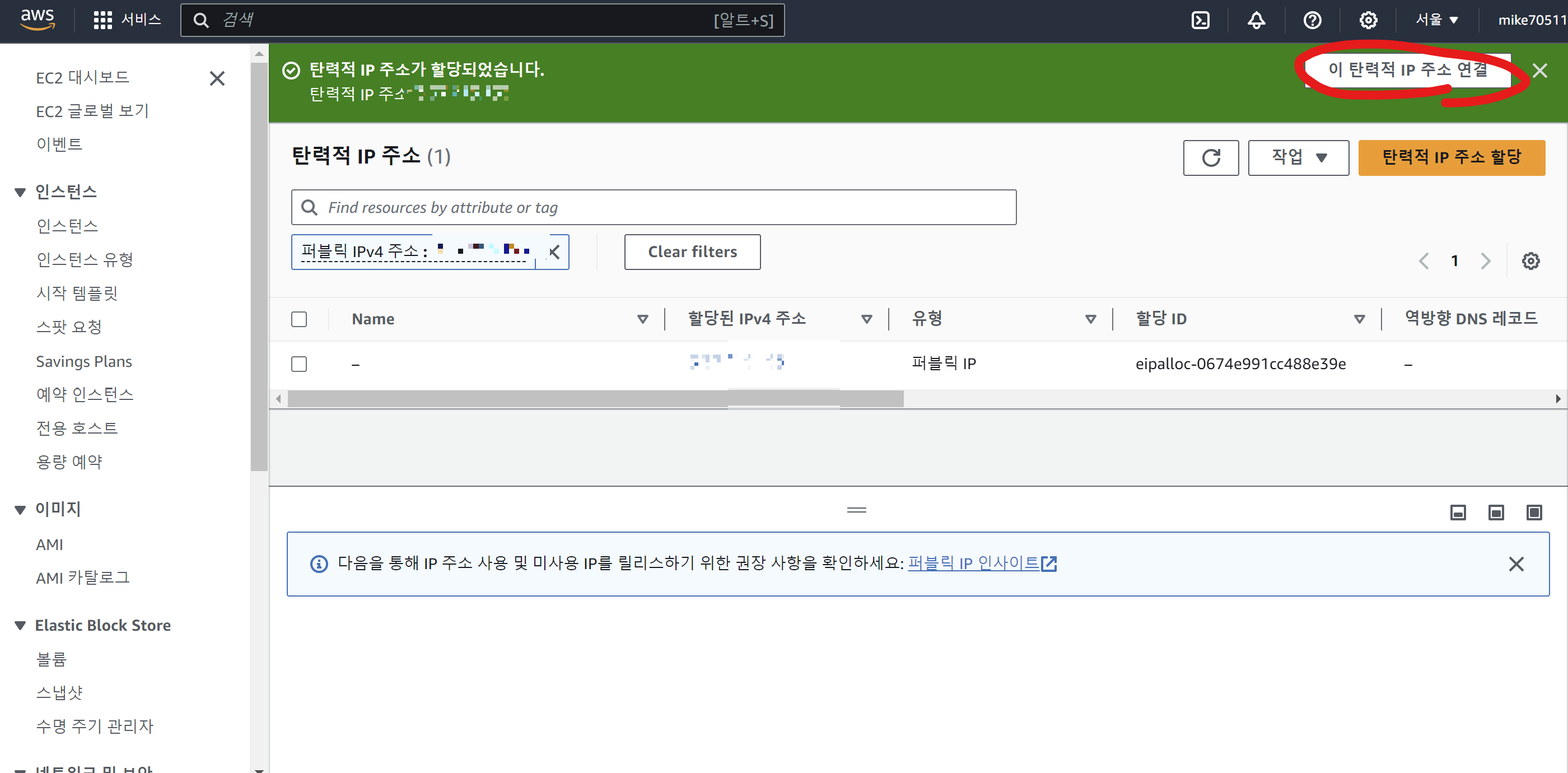 이제 탄력적 IP주소와 인스턴스를 연결해주시면 됩니다!
