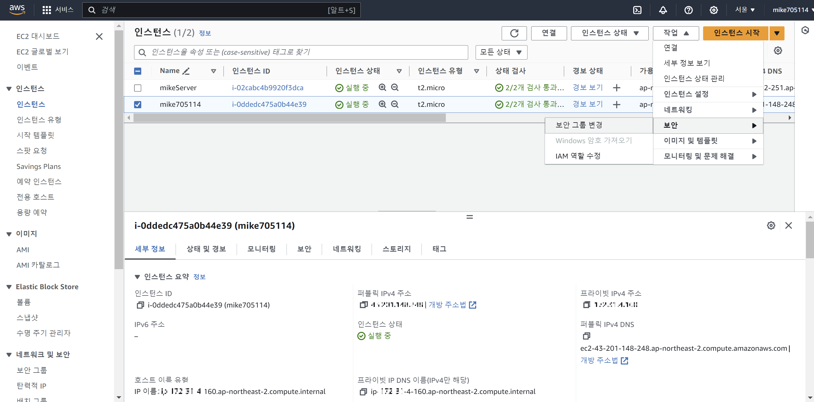 인스턴스 -> 작업 -> 보안 -> 보안 그룹 변경을 클릭합니다.