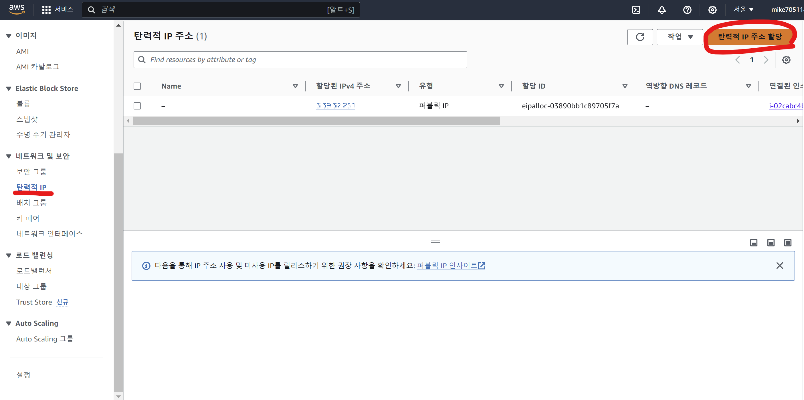 쉽게 말해서 인스턴스 서버를 재시작하면 IP주소가 변경되는 것을 방지하기 위해 탄력적 IP주소를 할당받아 사용합니다.