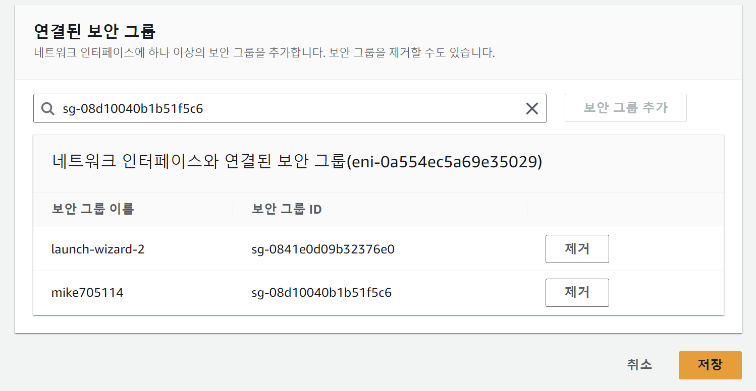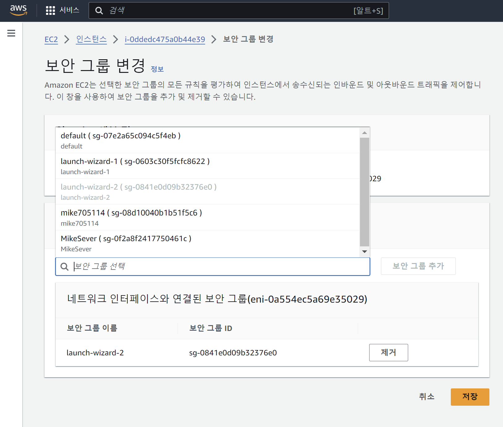 자! 이제 보안 그룹을 생성했으면 전에 생성한 인스턴스에 적용을 해야합니다!