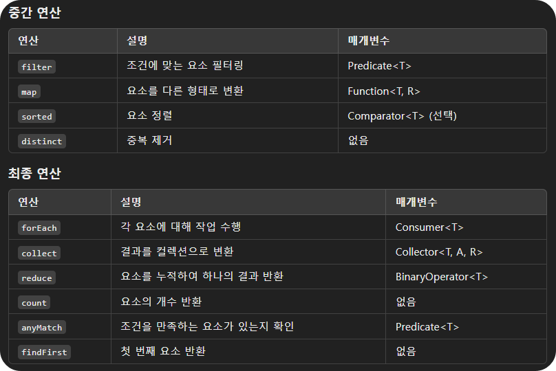 - 중간 연산 (Intermediate Operation): 데이터의 흐름을 변환 또는 필터링합니다.