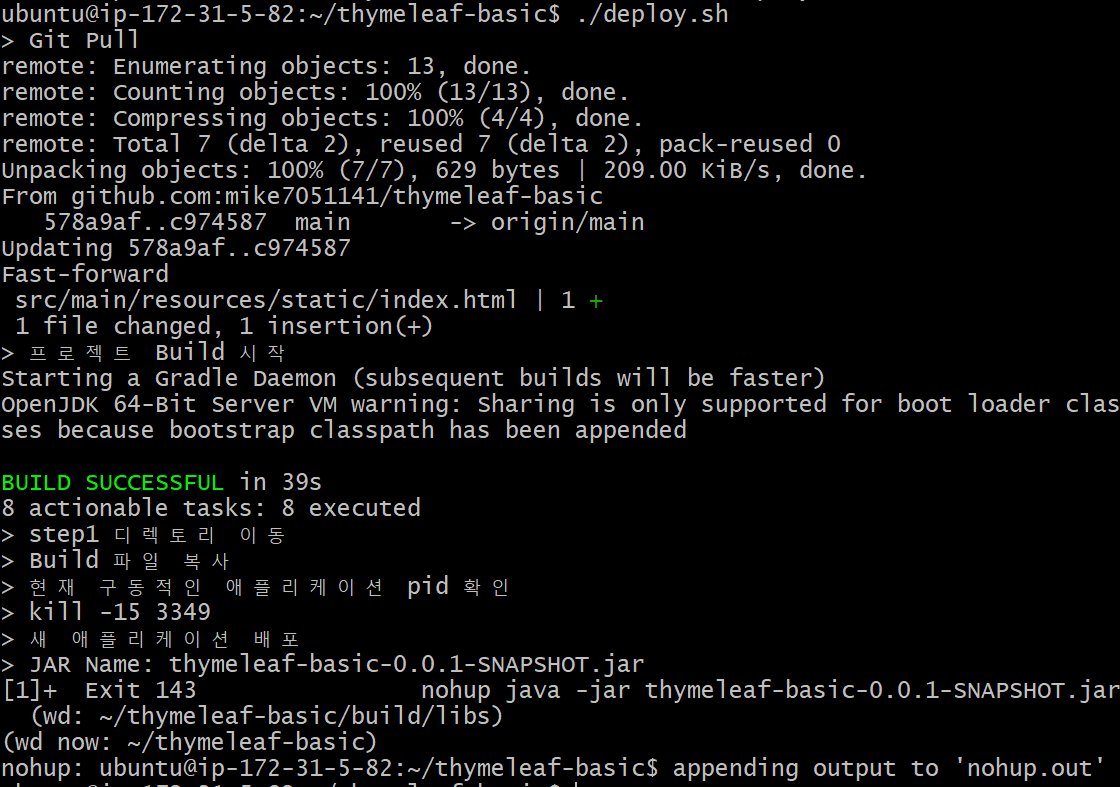 기존에 실행되던 서버를 죽이고, 깃으로부터 PULL해온 변경사항을 추가한 JAR파일을 새로 배포됩니다.